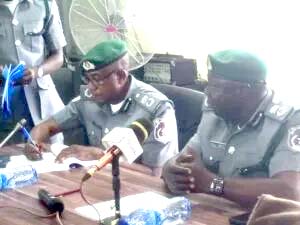 Comptroller Wale Adenuga, the former Controller of Seme Area Command of Nigeria Customs Service handing over to the new Area Controller of Seme Command, Comptroller L Kaila in Seme.